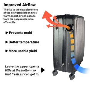 Basé sur notre système hydro, nous avons constaté qu’une circulation d’air considérablement améliorée (et donc une humidité beaucoup plus faible) est obtenue dans la valise lorsque la ventilation est installée en haut. En conséquence, nous proposons un kit de rénovation à tous les propriétaires de valises. Remarque : Le kit de rénovation est uniquement nécessaire pour les « anciens modèles de valises avant juillet 2024 ». Toutes les valises produites après juillet 2024 sont livrées avec le filtre à charbon actif préinstallé en haut. Le kit est compatible avec :